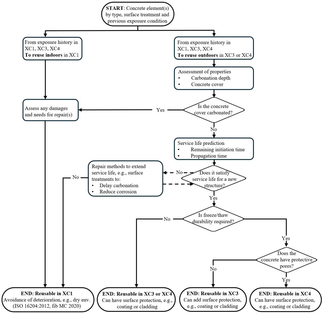 For industry practitioners, the study provides a practical decision-making flowchart to ensure service life and safe reuse based on specific exposure classes for carbonation-induced corrosion. Service life verification can be aligned with the exposure conditions of the second life. For example, if an element is fully carbonated and deemed insufficient for outdoor reuse due to a high risk of corrosion, it does not have to be crushed into waste. Because corrosion levels are negligible in dry environments, elements that are carbonated but in good structural condition can be safely reused indoors in dry environments (e.g., XC1 exposure).