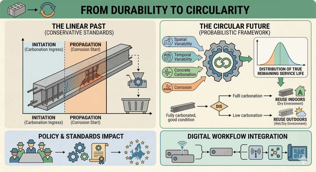 By bridging durability modelling, digital workflows, and circular construction strategies, this research helps move concrete reuse from experimental pilots toward a reliable and scalable practice, enabling the built environment to transition confidently from a linear economy toward a fully circular one.