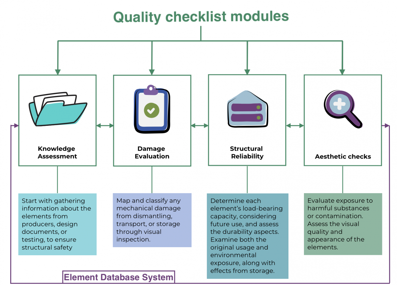 Figure 1. Quality check framework for evaluating the reuse of reclaimed elements. Figure by Agnese Scalbi.