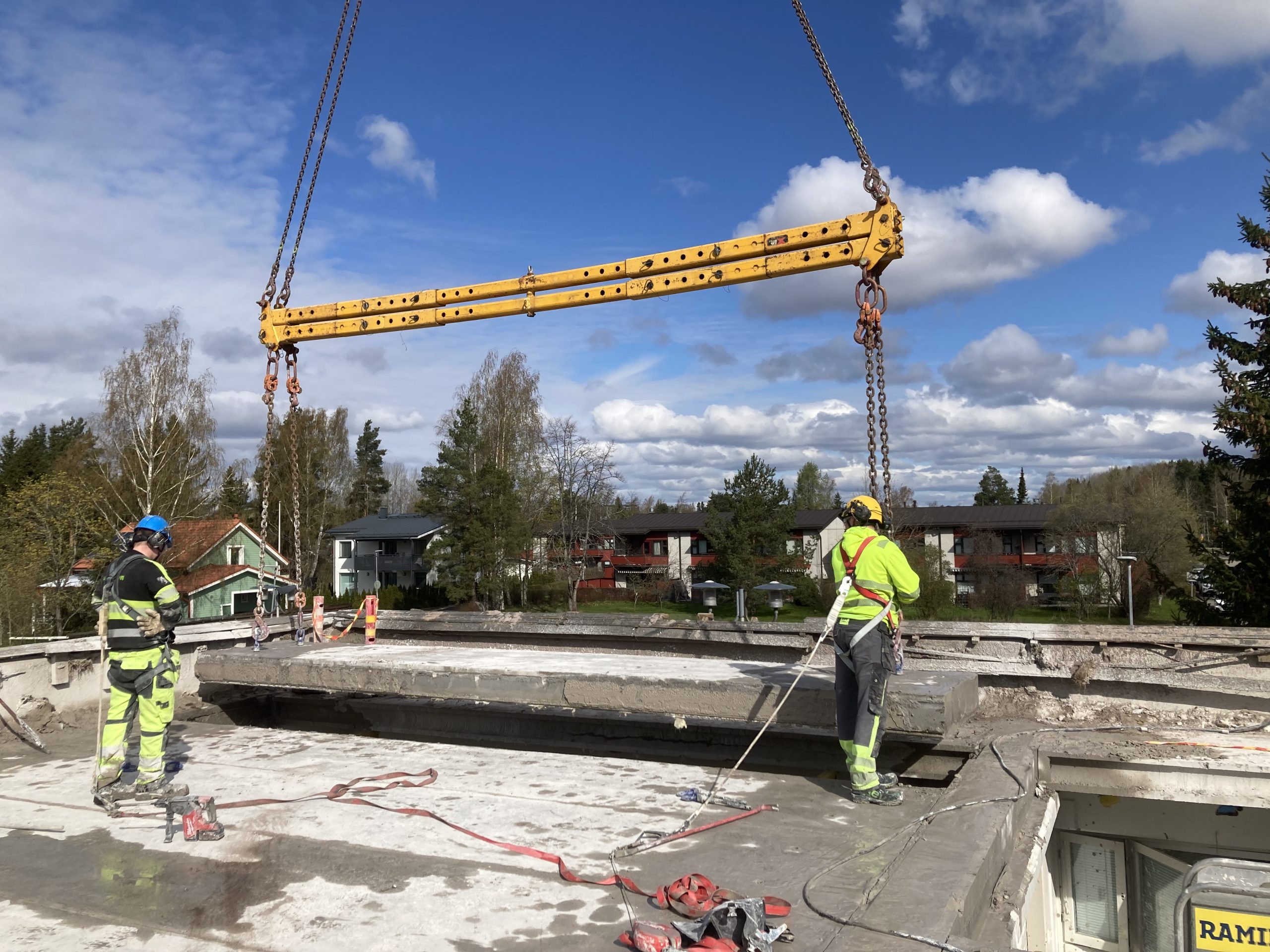 Umacon’s deconstruction workers detaching a hollow-core slab in May. (Photo Inari Weijo, Ramboll Finland Oy)
