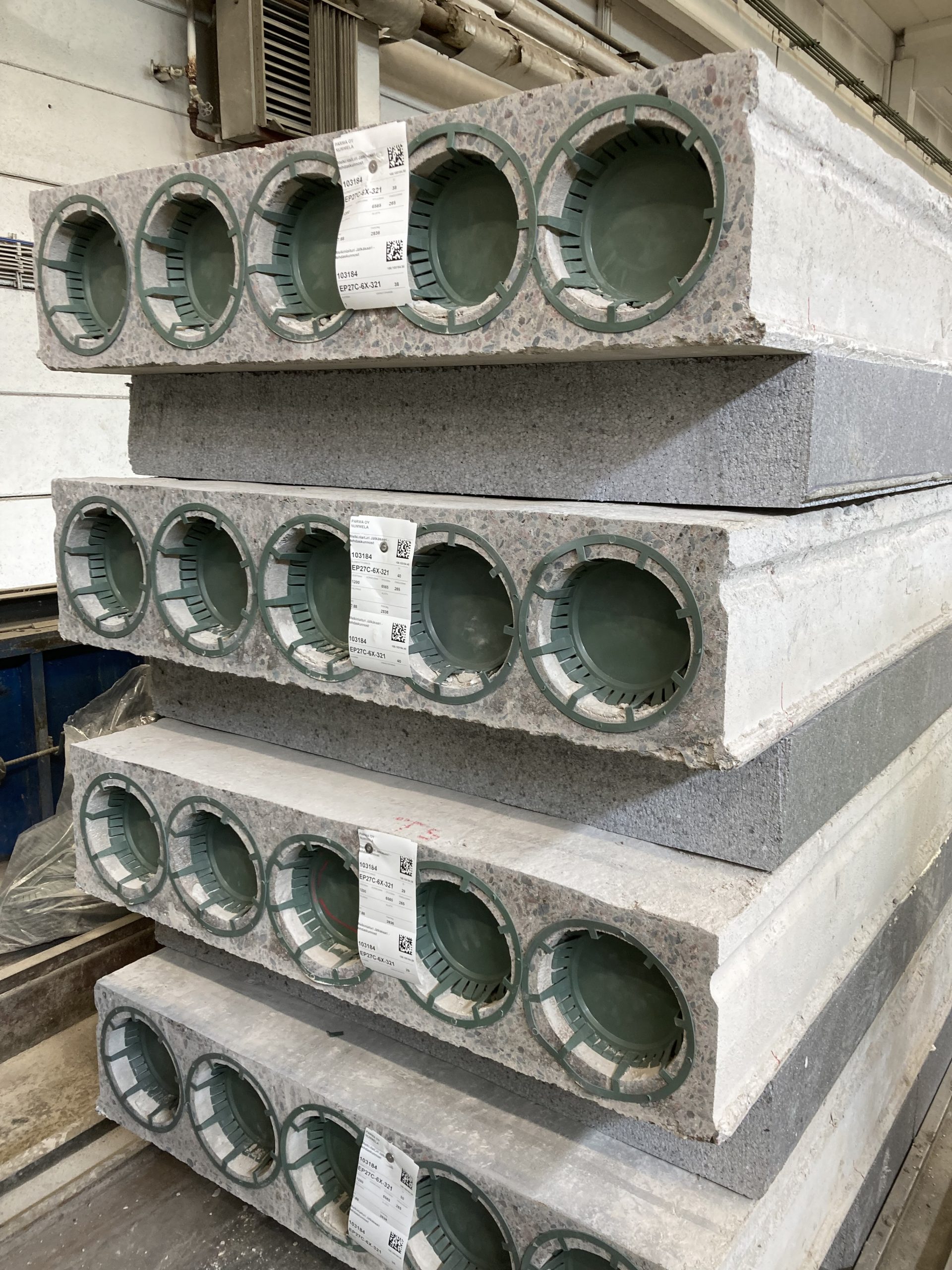 - Logistics and refurbishment in the factory are prepared so that the factory workflow is continuous and resembles manufacturing processes. Planning the logistics of hollow-core slabs and planning their tagging so that information about the origin of the slabs is maintained throughout the process.