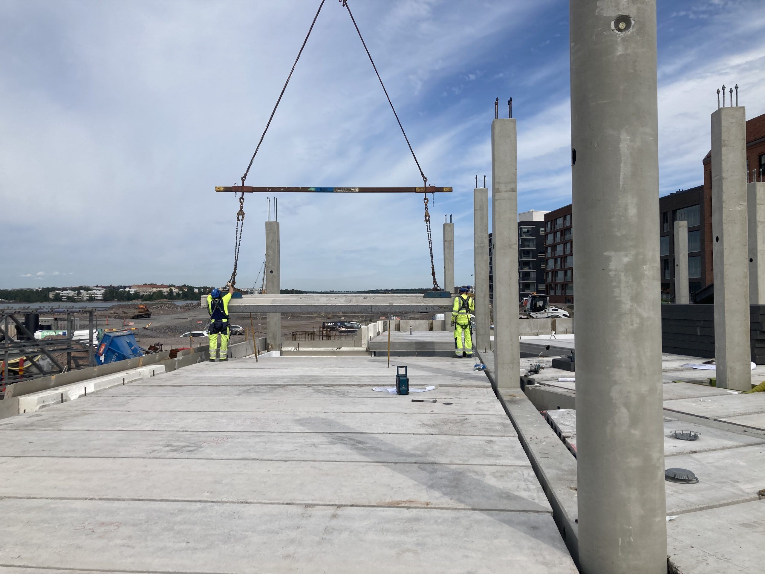 Installation of reused hollow-core slabs in Jätkäsaari, Helsinki. (Photo: Inari Weijo, Ramboll Finland Oy)